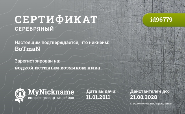 Nickname BoTmaN is registered to vodka is the true master of nick. Issued certificate ID96779. Issue date 11.01.2011.