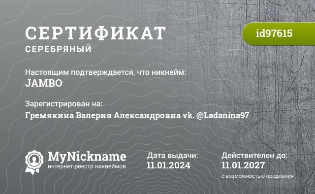 Nickname JAMBO is registered to Gremyakina Valeria Alexandrovna vk. @Ladanina97. Issued certificate ID97615. Issue date 11.01.2024.