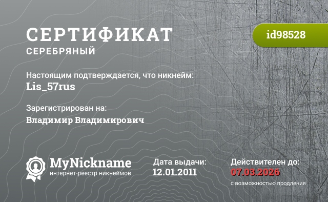 Nickname Lis_57rus is registered to Vladimir Vladimirovich. Issued certificate ID98528. Issue date 12.01.2011.