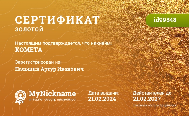 Сертификат на никнейм KOMETA, зарегистрирован на Пальшин Артур Иванович