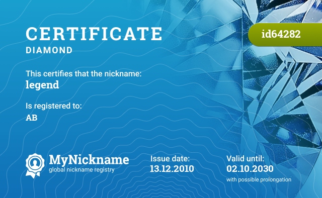 Сертификат на никнейм legend, зарегистрирован на AB