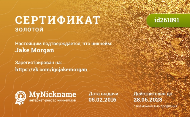 certificate for nickname: Jake Morgan (id261891)