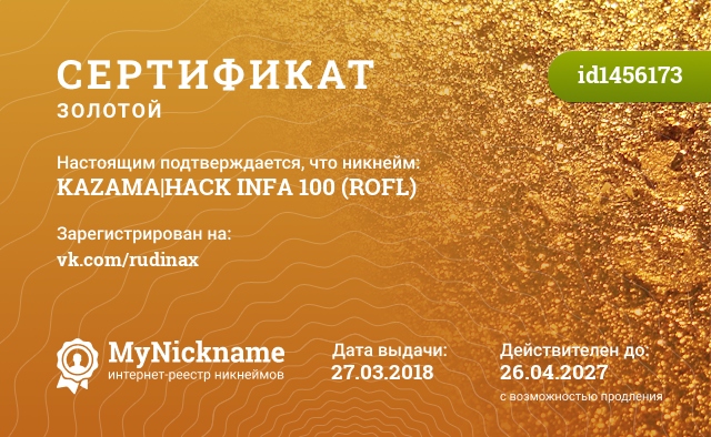 certificate for nickname: KAZAMA|HACK INFA 100 (ROFL) (id1456173)
