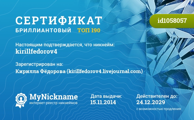 Nickname kirillfedorov4 is registered to Kirill Fedorov (kirillfedorov4.livejournal.com). Issued certificate ID1058057. Issue date 15.11.2014.