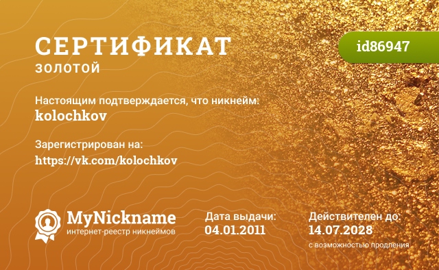 Никнейм kolochkov зарегистрирован на https://vk.com/kolochkov. Выдан золотой сертификат id86947. Дата выдачи 04.01.2011.