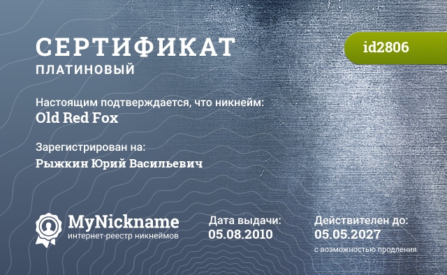 Certificate for nickname Old Red Fox is registered to: Ryzhkin Yury Vasilievich