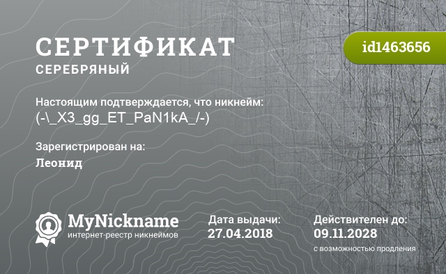 Nickname (-\_X3_gg_ET_PaN1kA_/-) is registered to Leonid. Issued certificate ID1463656. Issue date 27.04.2018.