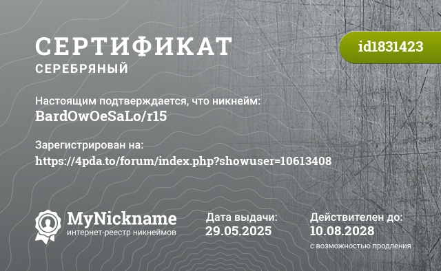 сертификат на никнейм BardOwOeSaLo/r15 (id1831423)