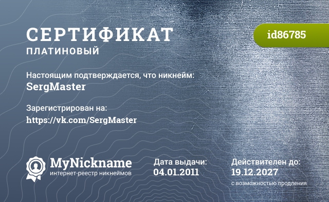 Никнейм SergMaster зарегистрирован на https://vk.com/SergMaster. Выдан сертификат id86785. Дата выдачи 04.01.2011.