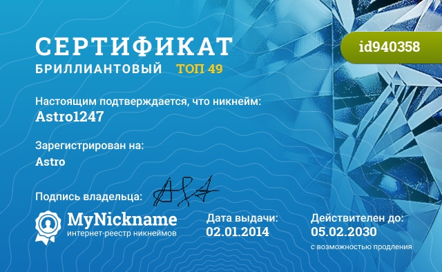 Никнейм Astro1247 зарегистрирован на Astro. Выдан сертификат id940358. Дата выдачи 02.01.2014.