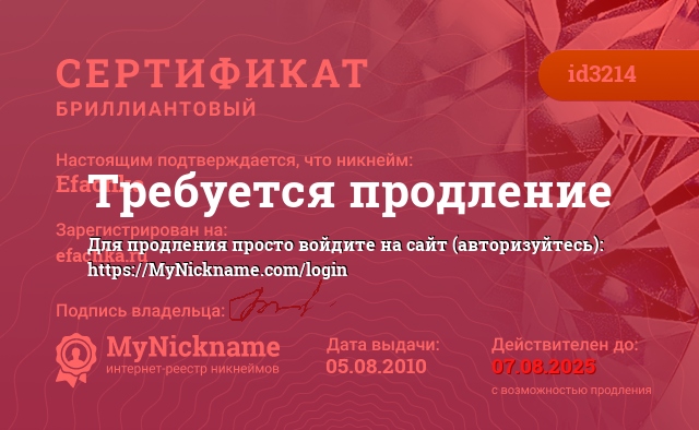 сертификат на никнейм Efachka (id3214)