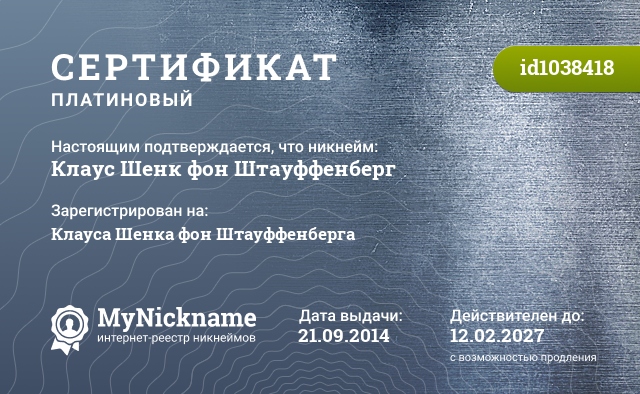 сертификат на никнейм Клаус Шенк фон Штауффенберг (id1038418)