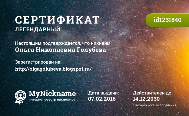 сертификат на никнейм Ольга Николаевна Голубева (id1231840)