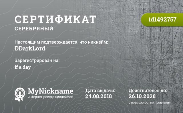 Никнейм DDarkLord зарегистрирован на if a day. Выдан сертификат id1492757. Дата выдачи 24.08.2018.