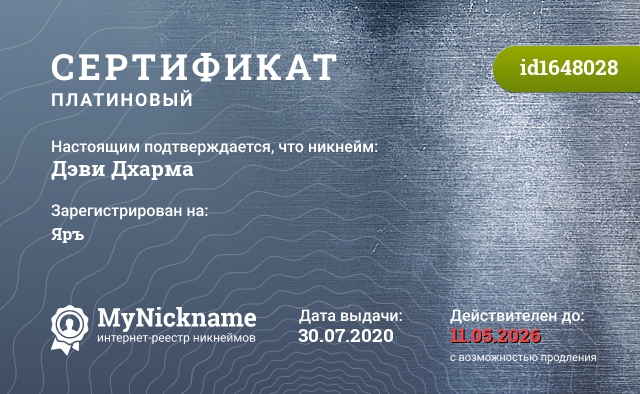 сертификат на никнейм Дэви Дхарма (id1648028)