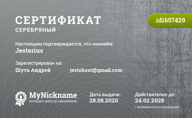 Никнейм Jesterius зарегистрирован на Шуть Андрей jestshout@gmail.com. Выдан сертификат id1657429. Дата выдачи 28.08.2020.