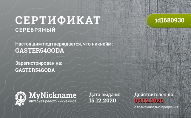 сертификат на никнейм GASTER54GODA (id1680930)