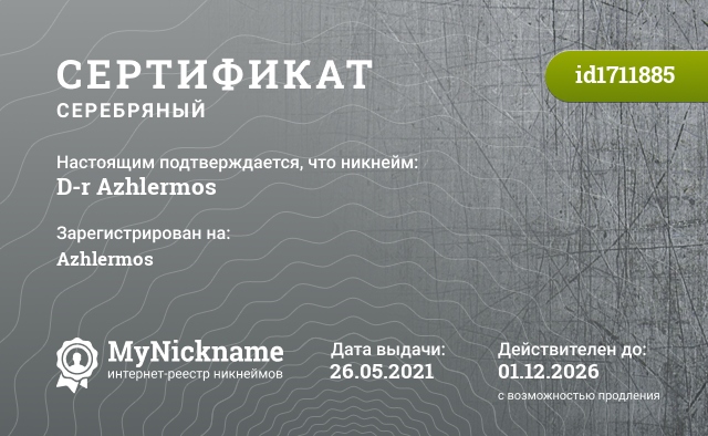 сертификат на никнейм D-r Azhlermos (id1711885)