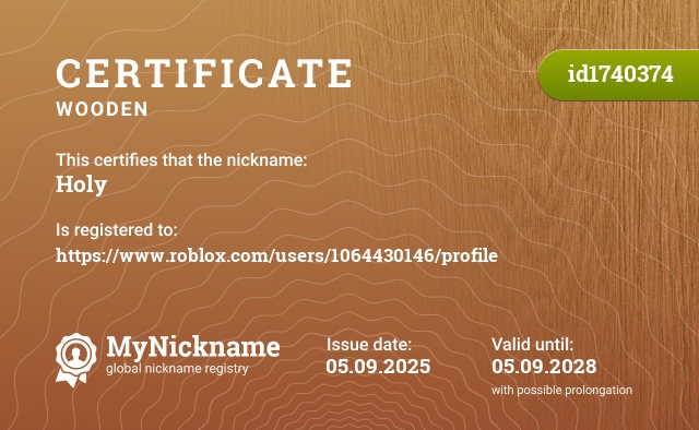 Никнейм Holy зарегистрирован на https://www.roblox.com/users/1064430146/profile. Выдан сертификат id1740374. Дата выдачи 05.09.2025.