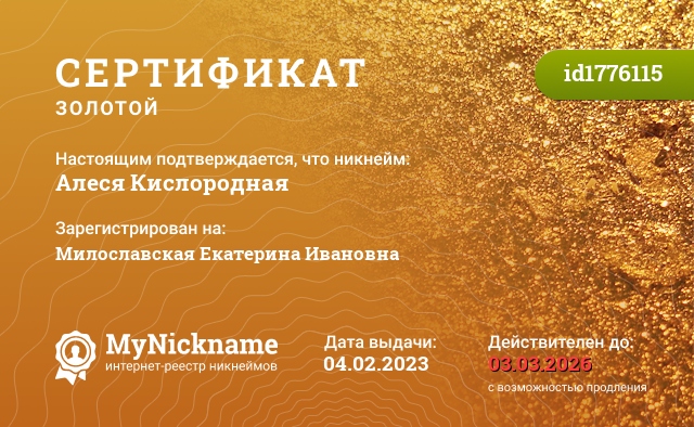 сертификат на никнейм Алеся Кислородная (id1776115)