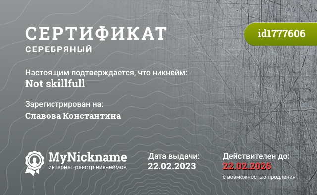 сертификат на никнейм Not skillfull (id1777606)