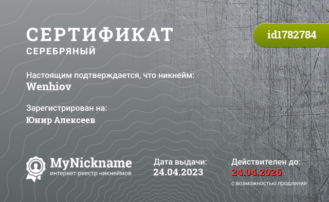 сертификат на никнейм Wenhiov (id1782784)