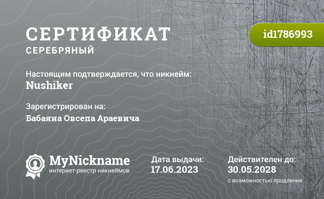 Никнейм Nushiker зарегистрирован на Бабаяна Овсепа Араевича. Выдан сертификат id1786993. Дата выдачи 17.06.2023.