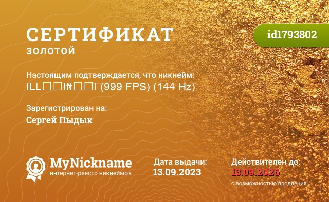 сертификат на никнейм ILLɄⲘI₦₳₮I (999 FPS) (144 Hz) (id1793802)