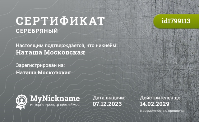 сертификат на никнейм Наташа Московская (id1799113)