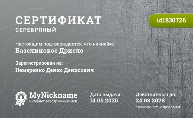 сертификат на никнейм Вазелиновое Дрисло (id1830726)
