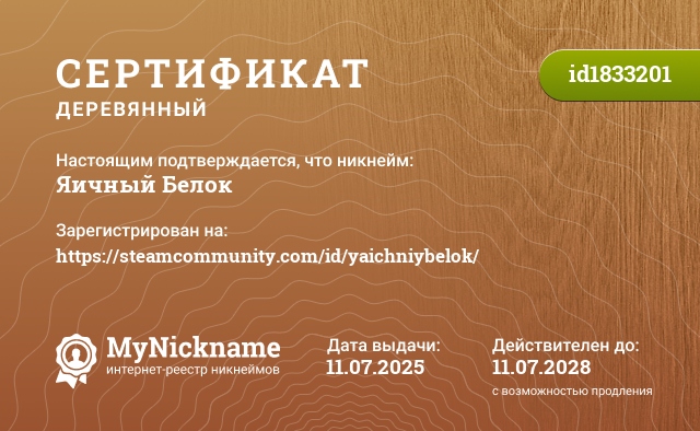 Никнейм Яичный Белок зарегистрирован на https://steamcommunity.com/id/yaichniybelok/. Выдан сертификат id1833201. Дата выдачи 11.07.2025.