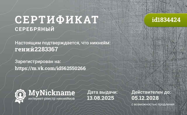 Никнейм гений2283367 зарегистрирован на https://m.vk.com/id562550266. Выдан сертификат id1834424. Дата выдачи 13.08.2025.