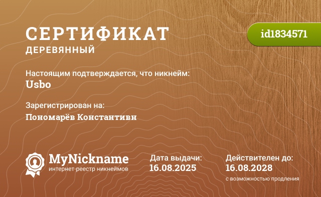 сертификат на никнейм Usbo (id1834571)