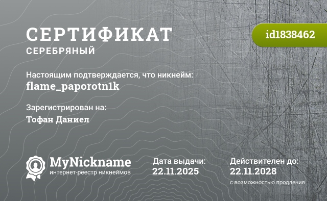 сертификат на никнейм flame_paporotn1k (id1838462)