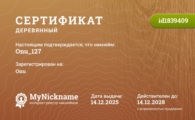 сертификат на никнейм Onu_127 (id1839409)