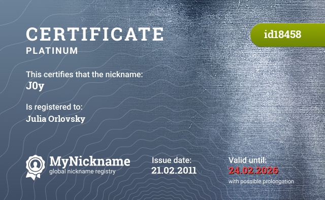 Никнейм J0y зарегистрирован на Julia Orlovska. Выдан сертификат id18458. Дата выдачи 21.02.2011.