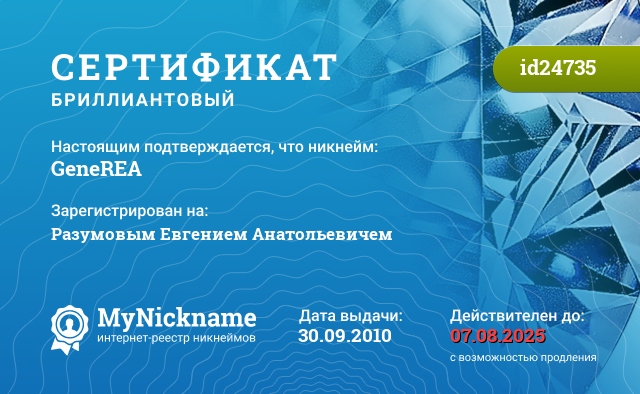 Никнейм GeneREA зарегистрирован на Разумовым Евгением Анатольевичем. Выдан сертификат id24735. Дата выдачи 30.09.2010.