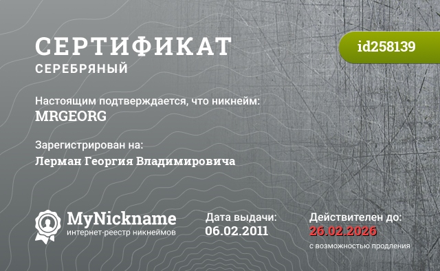 Никнейм MRGEORG зарегистрирован на Лерман Георгия Владимировича. Выдан сертификат id258139. Дата выдачи 06.02.2011.