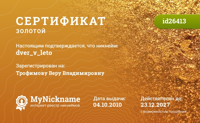 Никнейм dver_v_leto зарегистрирован на Трофимову Веру Владимировну. Выдан сертификат id26413. Дата выдачи 04.10.2010.