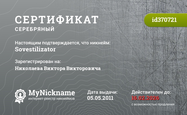 Никнейм Sovestilizator зарегистрирован на Николаева Виктора Викторовича. Выдан сертификат id370721. Дата выдачи 05.05.2011.