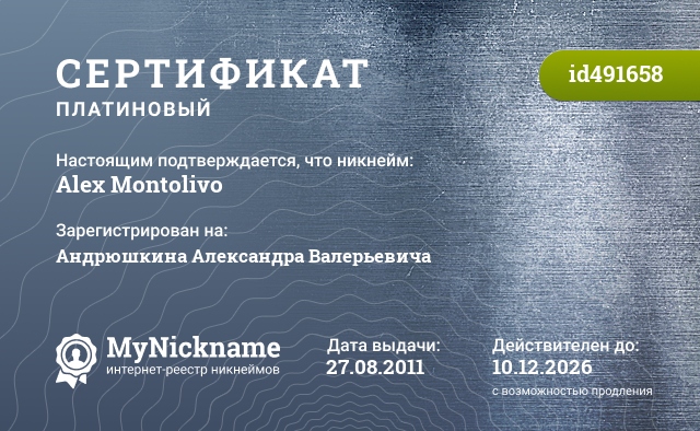 Никнейм Alex Montolivo зарегистрирован на Андрюшкина Александра Валерьевича. Выдан сертификат id491658. Дата выдачи 27.08.2011.