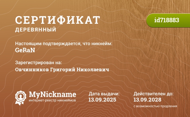 Никнейм GeRaN зарегистрирован на Овчинников Григорий Николаевич. Выдан сертификат id718883. Дата выдачи 13.09.2025.