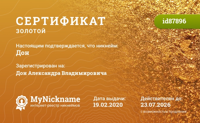 сертификат на никнейм Дон (id87896)