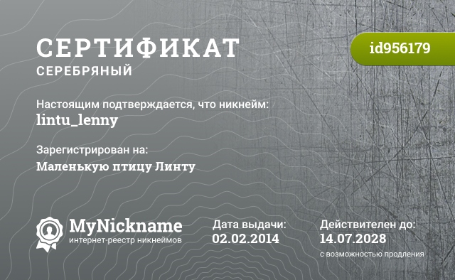 Никнейм lintu_lenny зарегистрирован на Маленькую птицу Линту. Выдан сертификат id956179. Дата выдачи 02.02.2014.