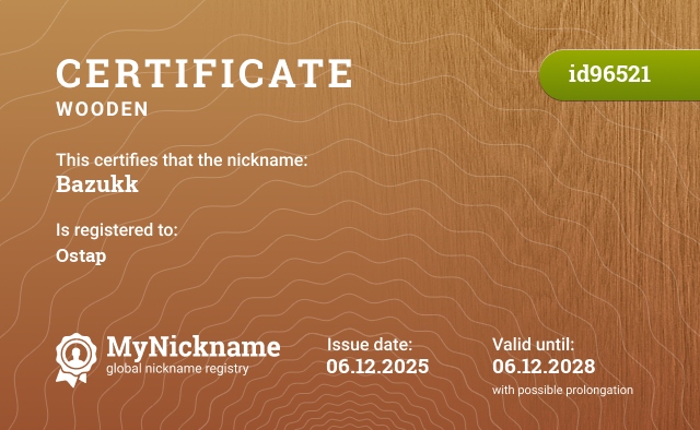 сертификат на никнейм Bazukk (id96521)