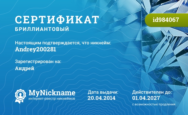 Никнейм Andrey200281 зарегистрирован на Андрей. Выдан сертификат id984067. Дата выдачи 20.04.2014.