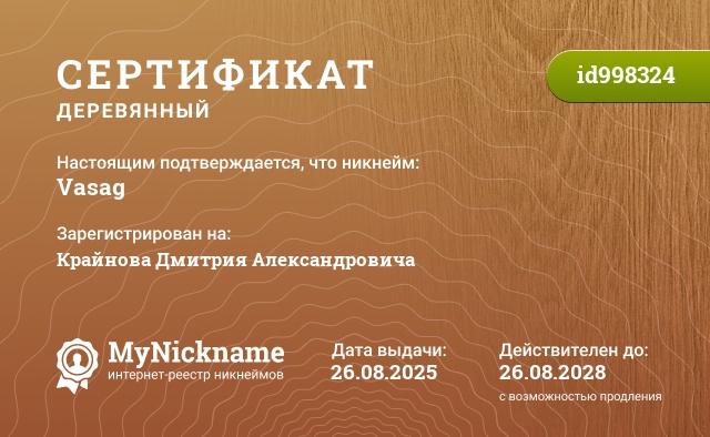 Никнейм Vasag зарегистрирован на Крайнова Дмитрия Александровича. Выдан сертификат id998324. Дата выдачи 26.08.2025.