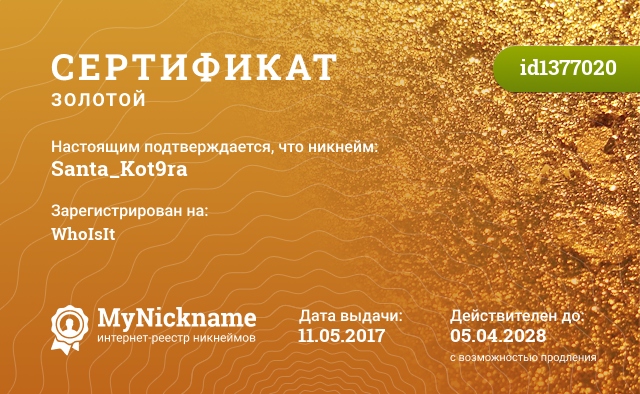 certificate for nickname: Santa_Kot9ra (id1377020)