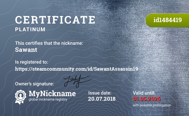 сертификат на никнейм Sawant (id1484419)
