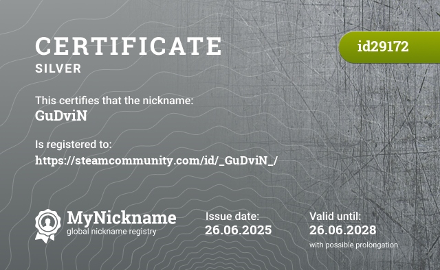 Сертификат на никнейм GuDviN, зарегистрирован на https://steamcommunity.com/id/_GuDviN_/